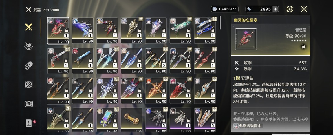 武器大部分該有的都有(缺尤諾、折枝專武)