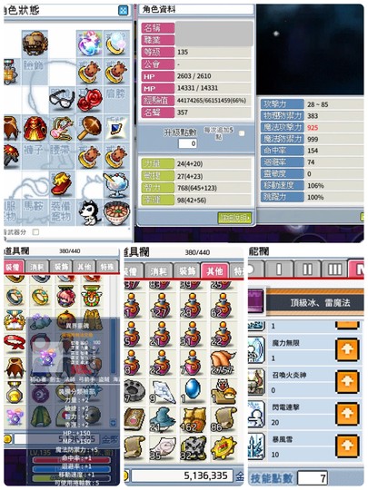 135 冰雷 經驗 66%,楓祝+精神強化925AP,AP已重置過目前幸運42如圖,身上有一顆乾淨異界還沒穿,普拉、炎魔皆可打,楓幣2000萬、上古魔書任務已解可以在冰原直接買萬能藥、身上名聲快400幾乎是解任務所得,有問題歡迎詢問