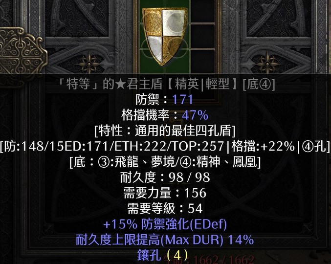 S13天梯 15ED14耐久171頂防4洞君主盾 /統盾/精神/鳳凰