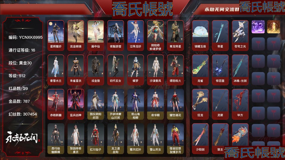 29紅787金丨等級512丨黃金3丨金磚11丨幻絲307454丨通行證未升級