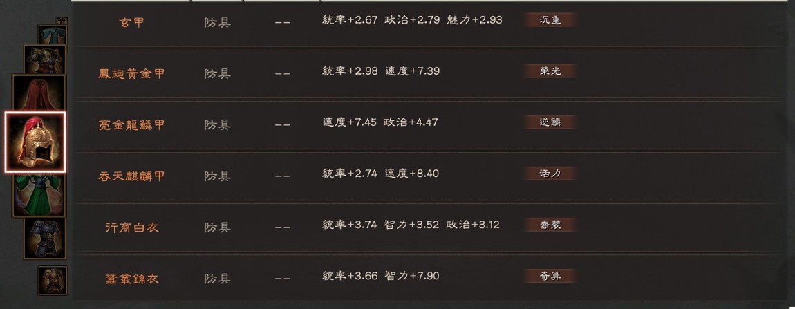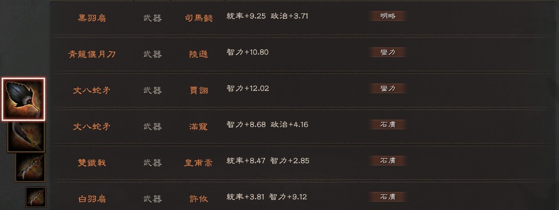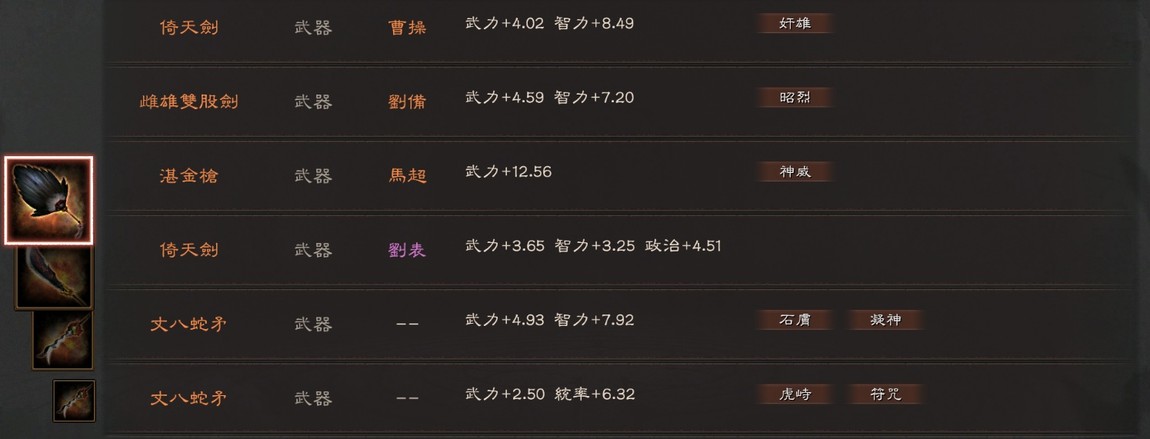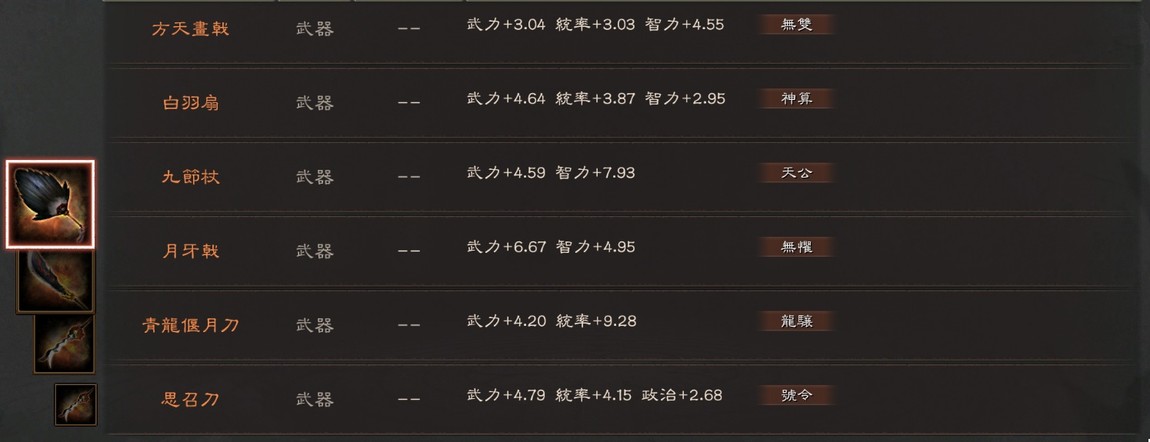 明略、武聖、昭烈、奸雄、無懼、神威、虎峙、雄烈、無雙、神算、天公、號令、龍讓