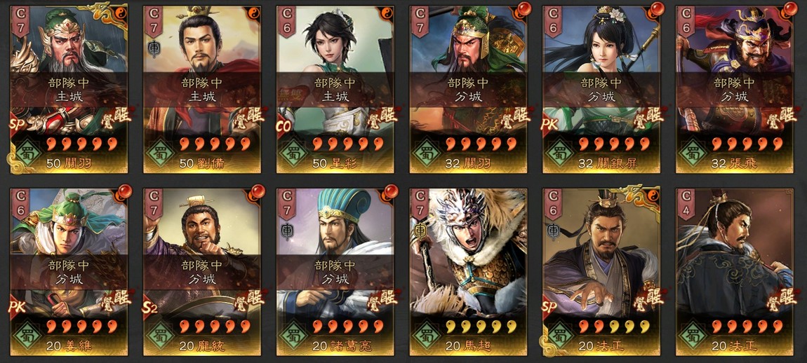 典藏皇馬馬超皇甫滿許攸2紅、典藏富貴滿、典藏法官關羽劉備or星彩滿 法正2紅、離月弓貂蟬2紅其餘滿.... etc 請自行看圖。