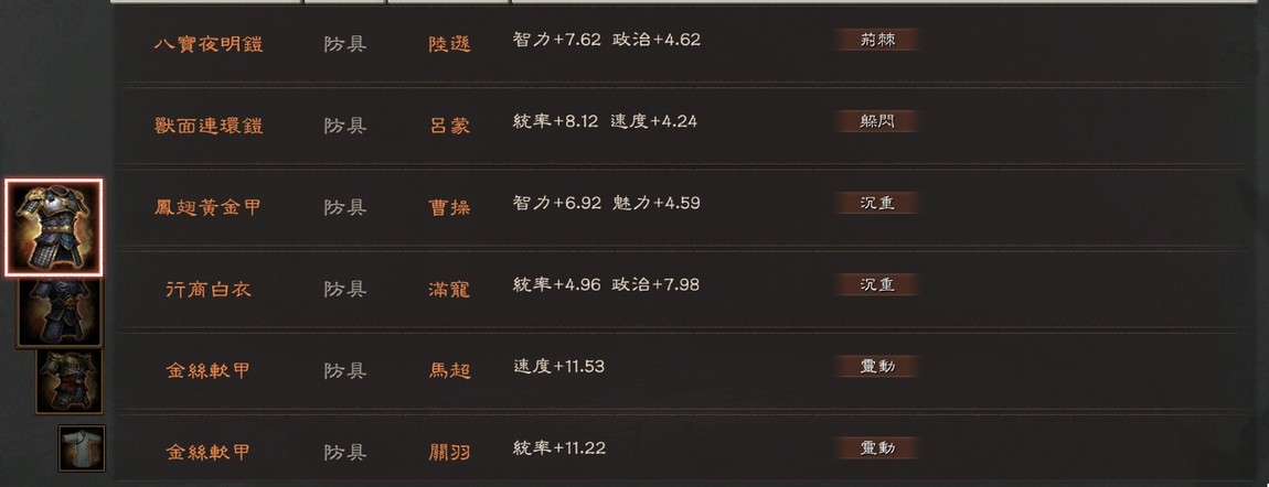 沉重、4靈動、3援助、長慮、雍雅、喬裝、奇算