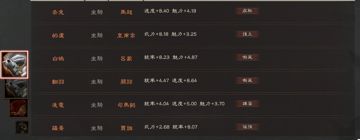 雄姿、出奇、衝陣、忠誠、踩踏、疾馳、護主