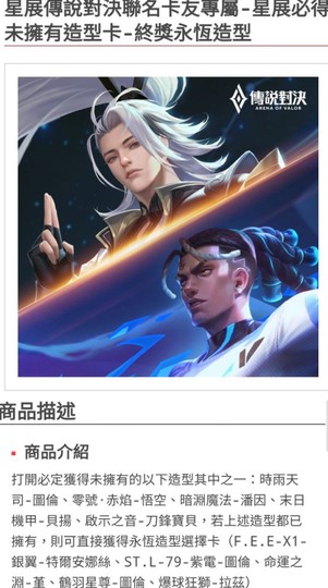 打開必定獲得未擁有的以下造型其中之一:時雨天司-圖倫、零號·赤焰-悟空、暗淵魔法-潘因、末日機甲-貝揚、啟示之音-刀鋒寶貝,若上述造型都已擁有,則可直接獲得永恆造型選擇卡(F.E.E-X1-銀翼-特爾安娜絲、ST.L-79-紫電-圖倫、命運之淵-堇、鶴羽星尊-圖倫、爆球狂獅-拉茲)