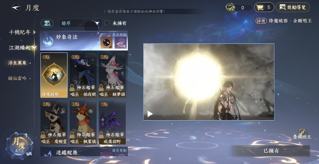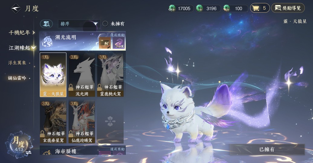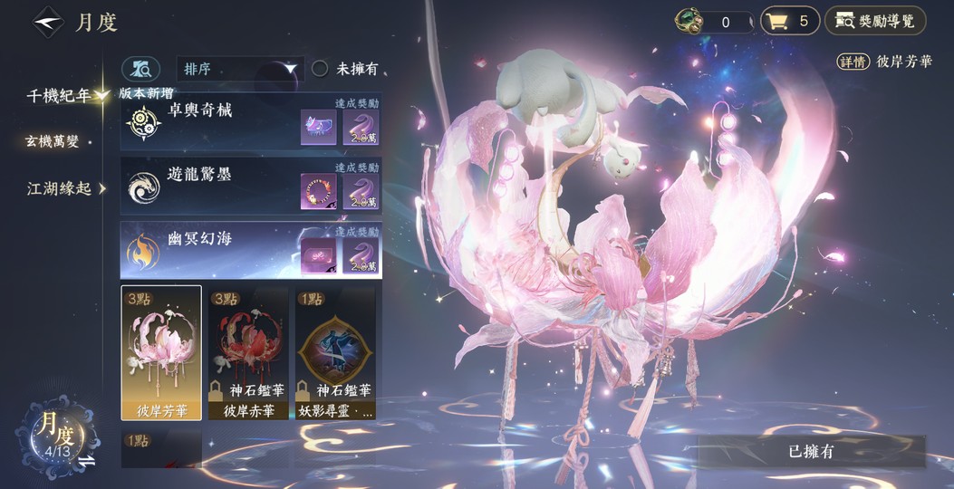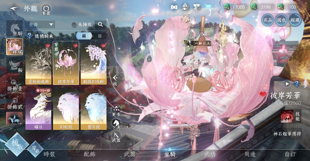 祥瑞坐騎: 靈猊銜威 (雙獅拉車)、彼岸芳華、幻虹猊、碧月猊、月亮。