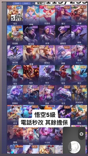 【Garena帳有綁定、戰場傳說、V8、115英、255造】貂蟬月亮、全星際、悟空5級、克里希泳裝