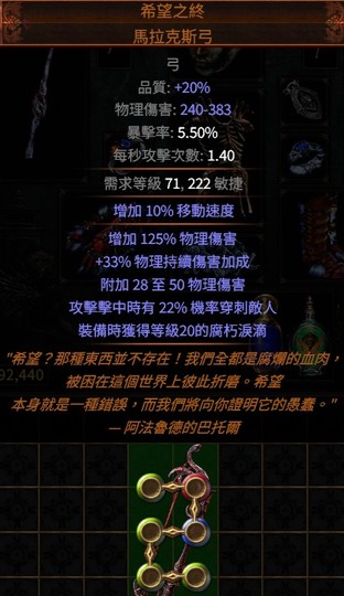 PoE👍傳奇6L→希望之終.馬拉克斯弓( 獲得等級20腐朽淚滴、穿刺 )