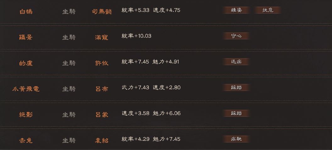 騎:2踩踏,1疾馳,雙特技(扶危雄姿),守心