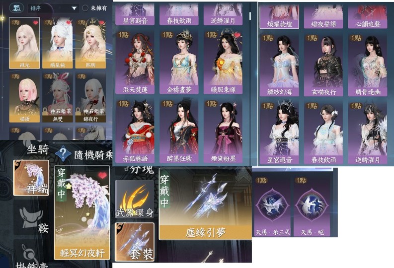 有3顆未用綁定天賞、2880*10件(詳圖)、2880*1武器外觀、部分天馬輕功