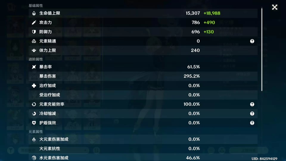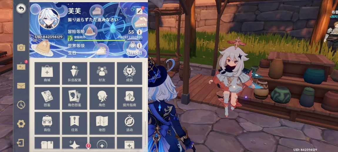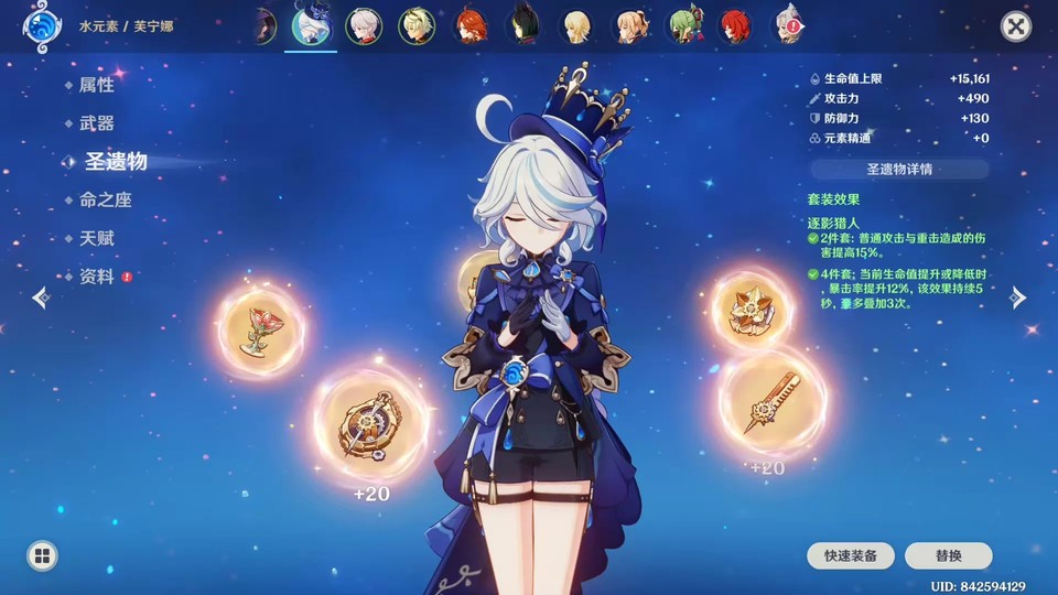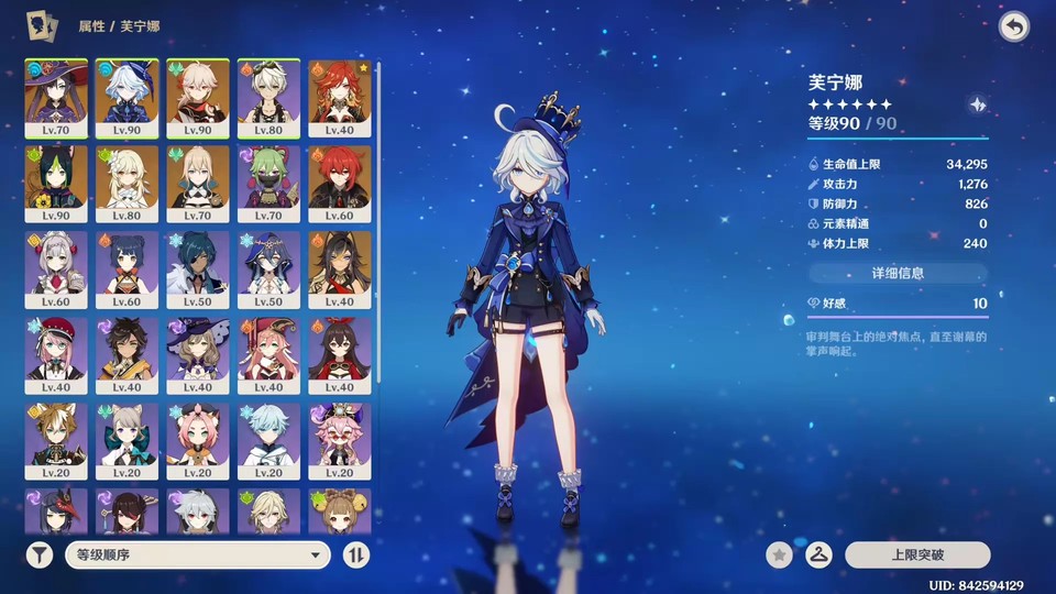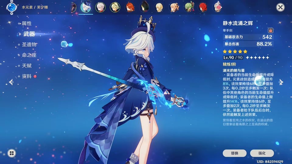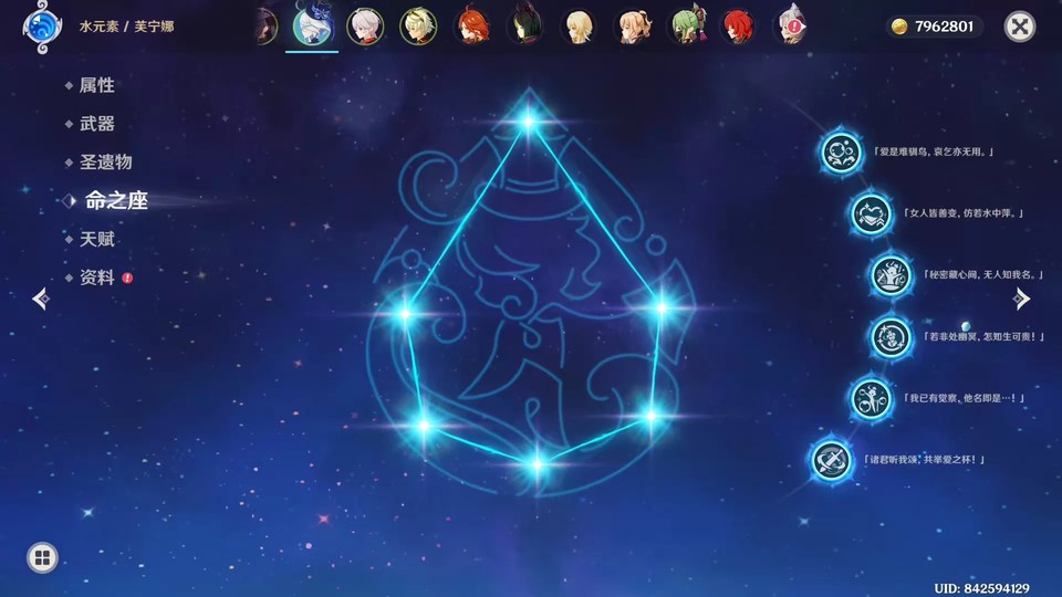 【女、55等、4金角、1金武】6+1水神號,女主,芙寧娜五星,專武靜水流湧之輝,練度高,命座全開,地圖資源多