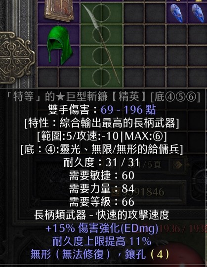 S13 天梯 傭兵最頂菁英神兵底才 15ED無形4洞巨型斬鐮 (無限 驕傲)