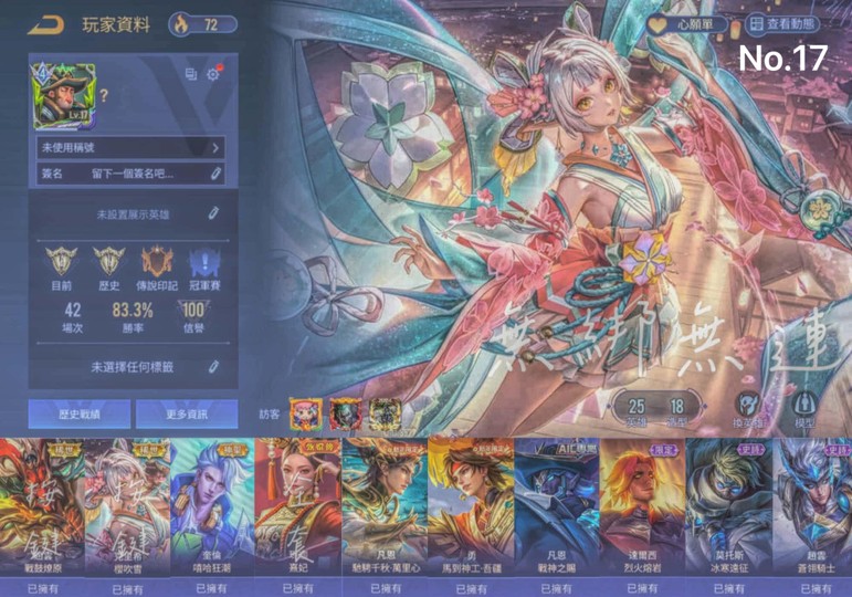 【Garena帳無綁無連、鉑金、V2、25英、18造】高勝率 戰鼓燎原 櫻吹雪 新年