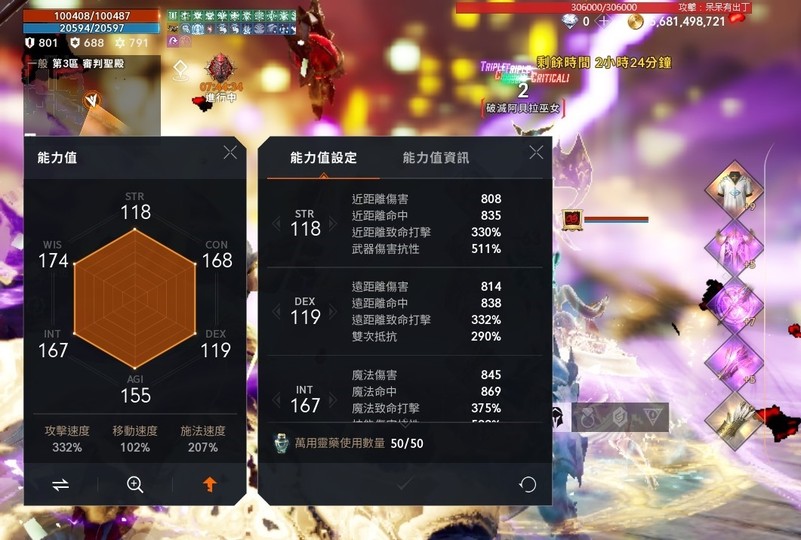 ★三圍: 802/681/793 (穿下列裝)傷害839/命中885/技傷820/衝抗418/衝命317 (穿下列裝,取換裝最大值)
