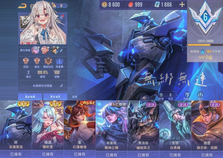 【Garena帳無綁無連、青銅、V6、15英、8造】低排百勝 點卷1800 蘇惡魔 緋淚櫻吹雪 菫紅蓮