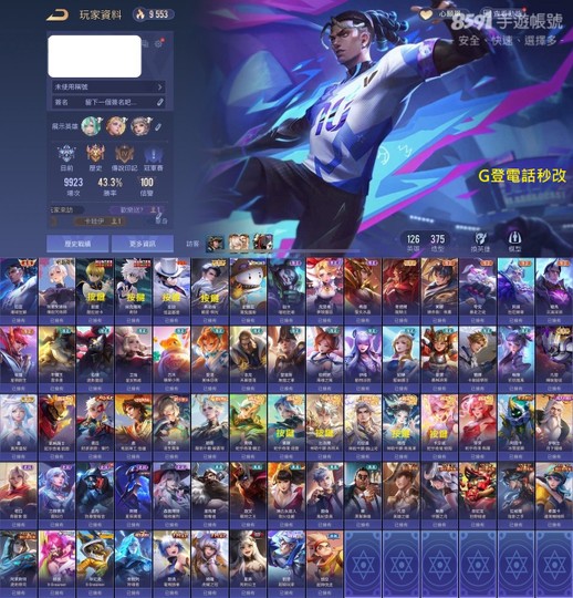 【Garena帳有綁定、鑽石、V5、126英、375造】爆球 造生 酷拉 奇犽