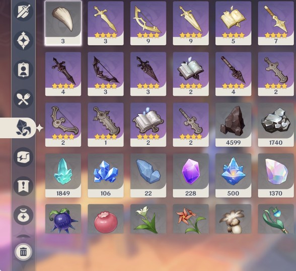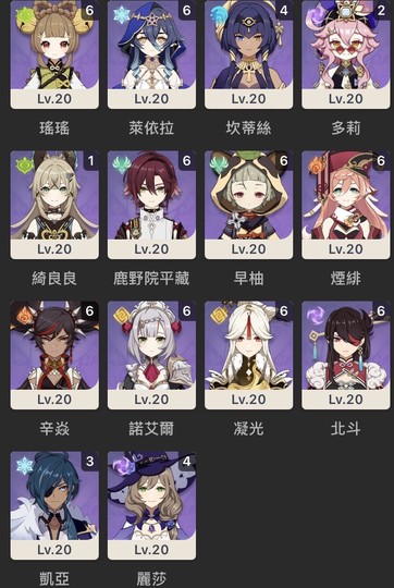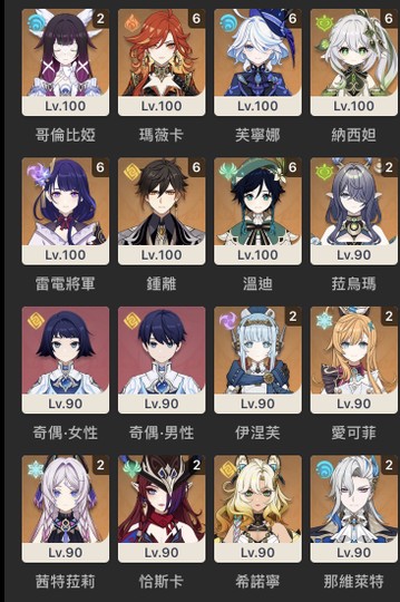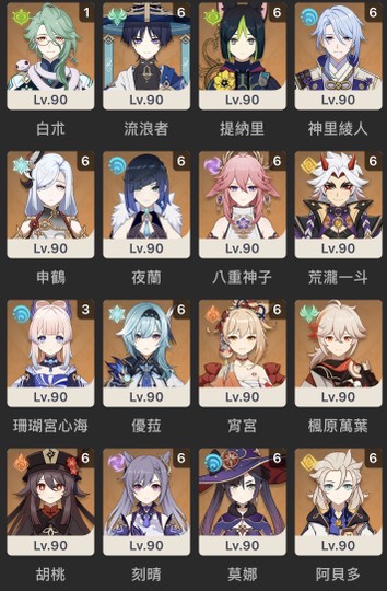 溫迪6+10(終末、天空、黎明)、鐘璃6+2、雷電將軍6+5、納西妲6+2、芙寧娜6+1、瑪薇卡6+1