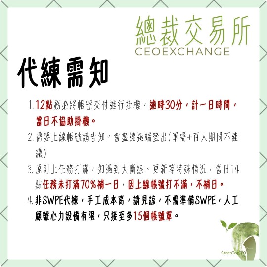 1. 每日12點務必交付帳號進行掛機,逾時30分,計一日時間,當日不協助掛機。