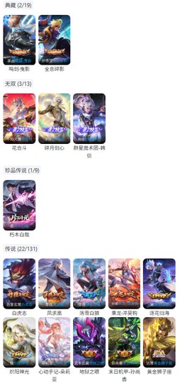 實名:可修改 貴族等級: V10 英雄數: 125 皮膚數: 473 榮耀水晶:武則天,天鵝之夢,星空夢想,倪克斯神諭,無限颶風號,活力突擊,殺手不太冷,大秦宣太后,鳴劍・曳影,全息碎影,星域神啟,九霄神輝,弒槍獵影 無雙皮:真我赫茲 (瑤) 星傳說:幻海之心,幽冥之眼,金色仲夏夜 傳說皮:黃金獅子座,黃金射手座,冠軍飛將,雲鷹飛將,絳天戰甲,黃金白羊座,貓影幻舞,久勝戰神,熾陽神光,一念神魔,雲霓雀翎,末日機甲 - 孫尚香,地獄火,仲夏夜之夢,音你心動 - 小喬,海洋之心,地獄之眼,飛鳶探春,音你心動 - 周瑜,胖達榮榮,李逍遙,乞巧織情,時之戀人 - 劉備,游龍清影,淬星耀世,超時空戰士 - 狄仁傑,遇見胡旋,末日機甲 - 孫策,摯愛之約,摯愛花嫁,記憶之芯,灼幽烈陽,妄想實況,鶴歸松棲 (雲纓), 大喬 - 時之奇旅,艾琳覓芳蹤,啟明星使 限定皮:冰鋒戰神,遇見飛天,李小龍,奔雷神使,遊園驚夢,梁祝,御風驍將,時雨天司,白鶴梁神女,武聖,異界靈契,玄嵩,白晶晶,天狼溯光者,虎魄,神威,蜜橘之夏,幽恆,時之彼端,奇蹟聖誕,乒乒小將,青春決賽季,天狼狩獵者,冰霜戀舞曲,天狼運算者,逐夢之星,逐夢之影,熱情桑巴,逐夢之光,神奇女俠,天狼繪夢者,鳳求凰,寅虎・御盾,白虎志,青龍志,朱雀志,鳳凰于飛,如夢令 - 嫦娥,純白花嫁,至尊寶,默契交鋒 - 蘭陵王,真愛至上,一生所愛,如夢令 - 后羿,默契交鋒 - 花木蘭,寅虎・瑞焰,霸王別姬 - 項羽,霸王別姬 - 虞姬,高山流水,孫行者,豬悟能,匿光追影者,女兒國國王,傲雪梅槍,寅虎・赤拳,寅虎・心曲,寅虎・展翼,時之祈願 - 雲中君,時之祈願 - 瑤,補天,百木心槍,玉兔公主,啟示之音,匿光決鋒者,匿光啟智者,五穀豐年,山海・玄木吟,山海・碧波行,鳴野蒿
