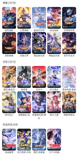 【傳說皮膚】:司空震願照山河定,桑啟鳴野蒿,干將莫邪久勝戰神,達摩黃金獅子座,百里玄策白虎志,后羿黃金射手座,李白鳳求凰,孫尚香末日機甲,宮本武藏地獄之眼,狄仁傑超時空戰士