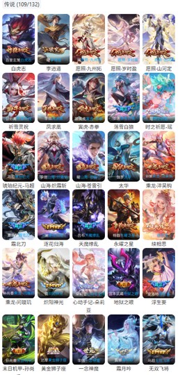 【傳說皮膚】:狄仁傑超時空戰士,孫悟空地獄火,宮本武藏地獄之眼,孫尚香末日機甲,李白鳳求凰,貂蟬仲夏夜之夢,后羿黃金射手座,夢奇胖達榮榮,花木蘭冠軍飛將,達摩黃金獅子座,虞姬雲霓雀翎,干將莫邪久勝戰神,貂蟬貓影幻舞,劉備時之戀人,李信一念神魔,曜雲鷹飛將,關羽武聖,虞姬啟明星使,鏡熾陽神光,趙云淬星耀世,馬超無雙飛將,李白詩劍行,呂布怒海麟威,曜山海蒼雷引,夏洛特浮生妄,魯班七號時之奇旅,瀾逐花歸海,孫尚香乘龍問璇璣,呂布曦玄引,桑啟鳴野蒿,裴擒虎祥瑞亨通,瀾願照九州拓