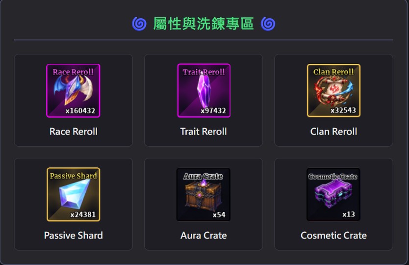 Trait Reroll (天賦洗鍊) (20,000 次) ........ 50T