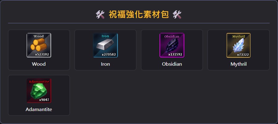 (內含:Wood 1185, Iron 575, Obsidian 365, Mythril 170, Adamantite 40)