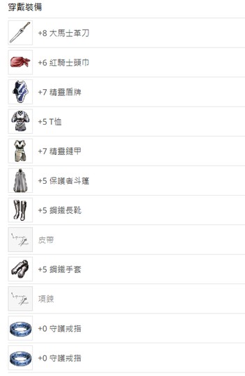 +5鋼手/+5鋼靴/+5保斗/+5內衣/+7精鏈/+7精盾/+6紅頭/守護戒指x2