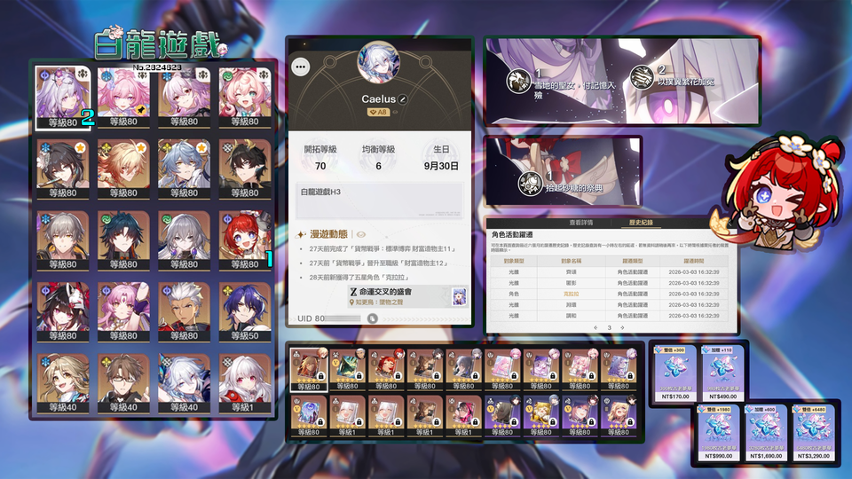 【女、70等、20金角、14金專】H3 遐蝶2+1昔漣0+1長夜月0+1風菫0+1緹寶0+1爻光騰荒星期日萬敵阮梅