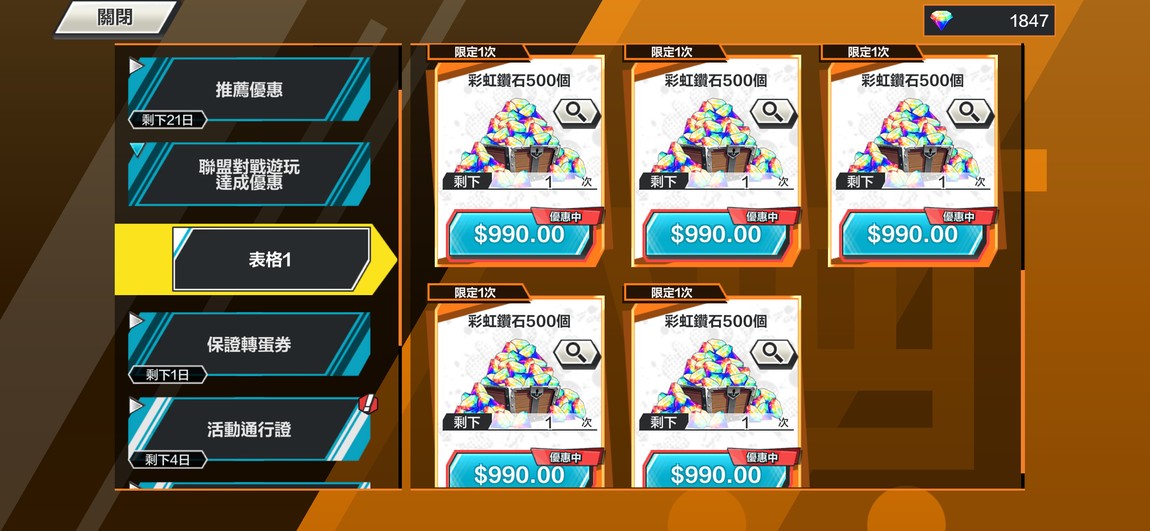 • 現有鑽石:1,847 個。