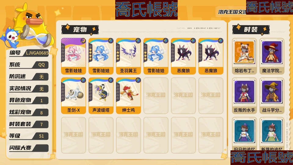 【OBLJVGA068542】男女主:女主,異色寵物數量:1,炫彩寵物數量:8,國王球:14,稜鏡球:2,許願星:144,異色寵物:雪影娃娃(異色炫彩),炫彩:雪影娃娃(炫彩),聖羽翼王(炫彩),雪影娃娃(炫彩),惡魔狼(炫彩),惡魔狼(炫彩),聖劍-X(炫彩),聲波緹塔(炫彩),紳士雞(炫彩),時裝套裝:熔岩布丁印象;詳情看圖【安卓QQ】【可二次實名】【無防沉迷】【官方截圖】異色炫彩雪影娃娃