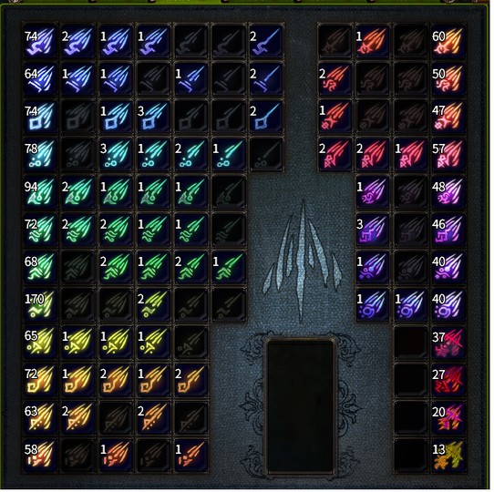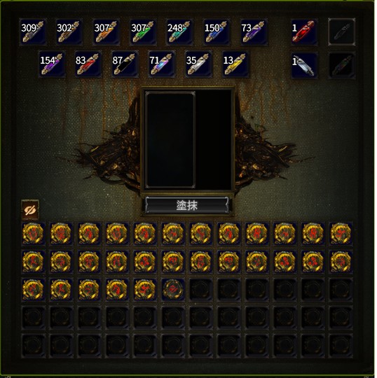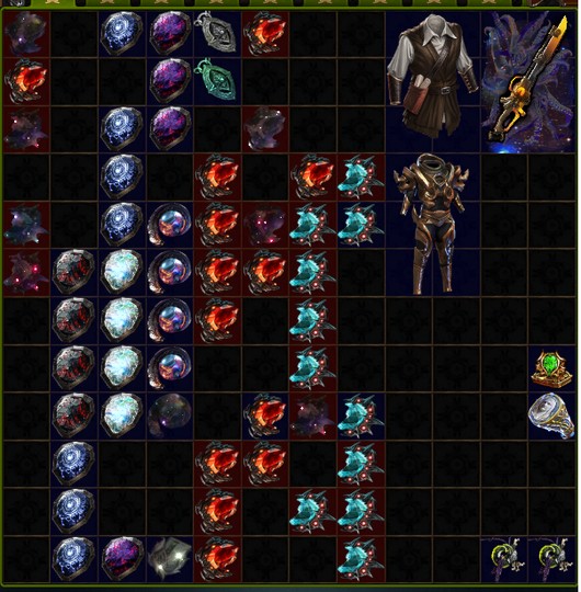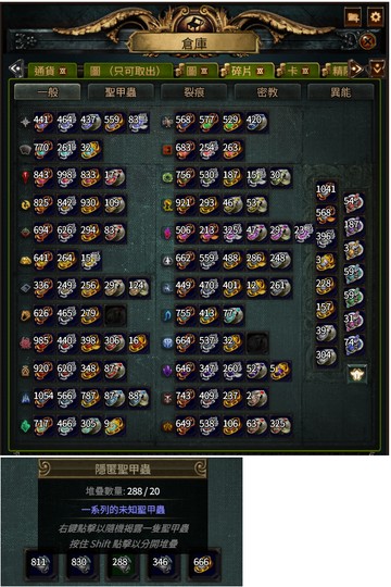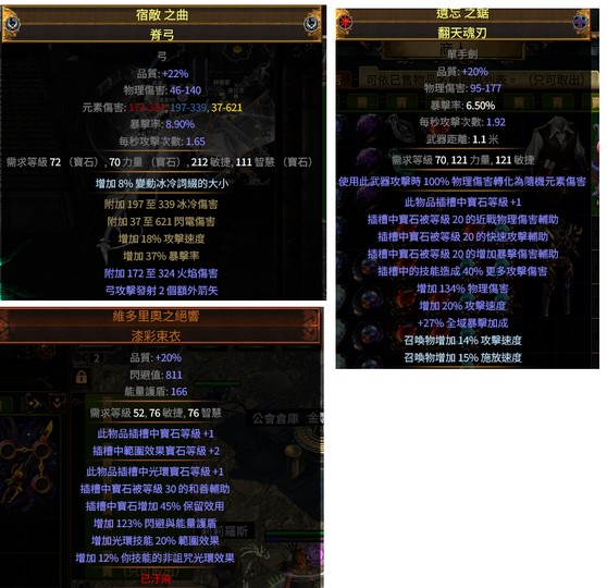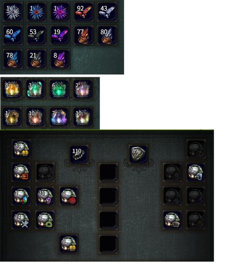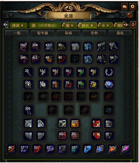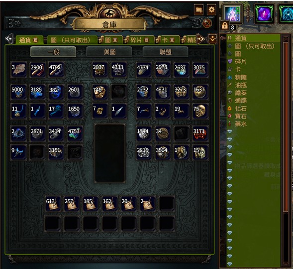 倉庫:(通貨.地圖.碎片.卡片.精隨.油瓶.譫妄.通牒.化石.寶石.藥水)*1 高級倉庫頁*24 商人倉庫頁*10