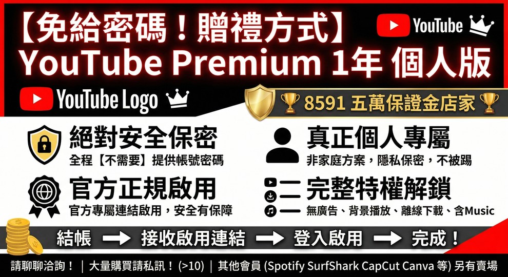 【免給密碼!贈禮方式!】YouTube Premium 1年 個人版 請看內文