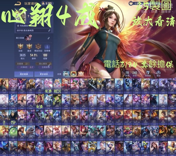 【Garena帳有綁定、鑽石、V9、121英、242造】鳳來 紫電 特爾新年 傑諾斯 美少女 月落 小丑女