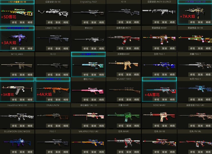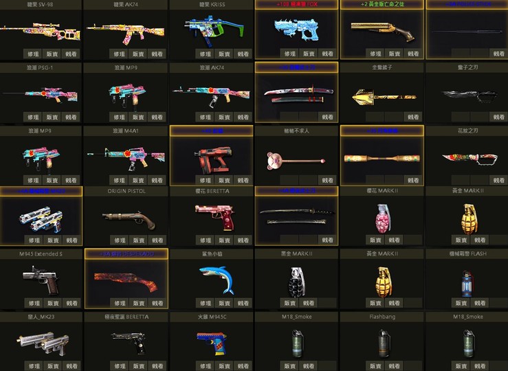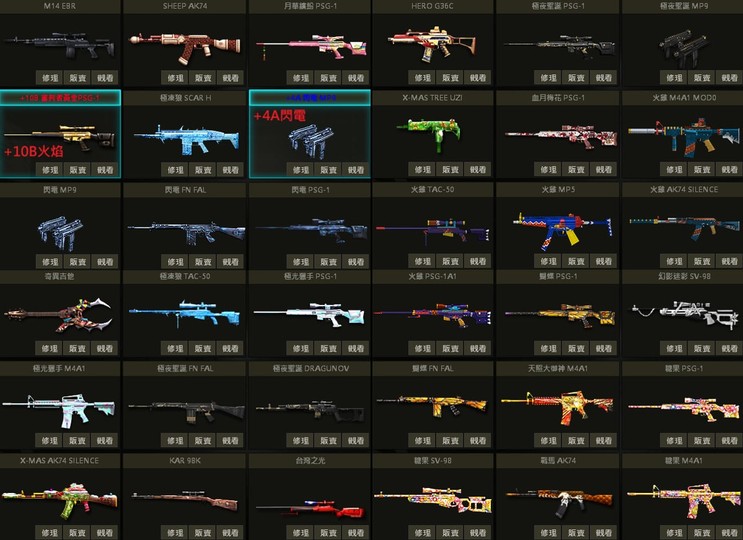 可改手機、小蜜蜂聖誕幻影糖果花札SV、白P、10把M4、冥王貴族U、極夜SVD