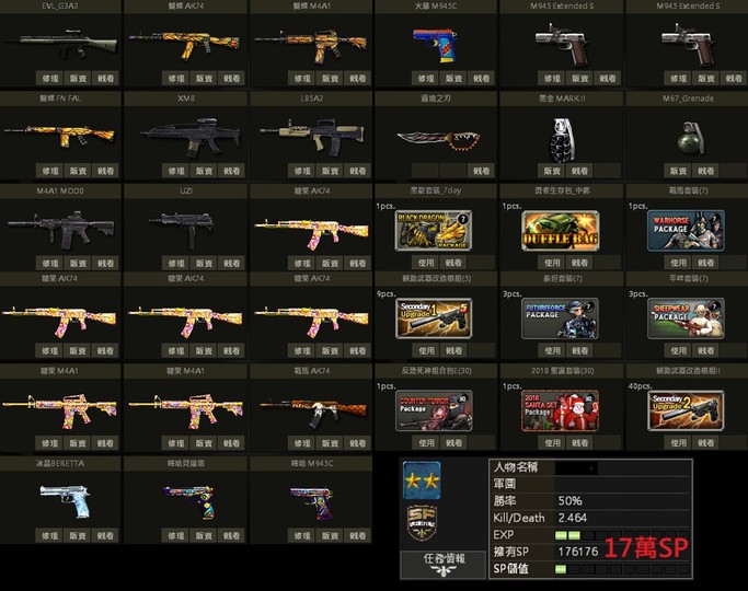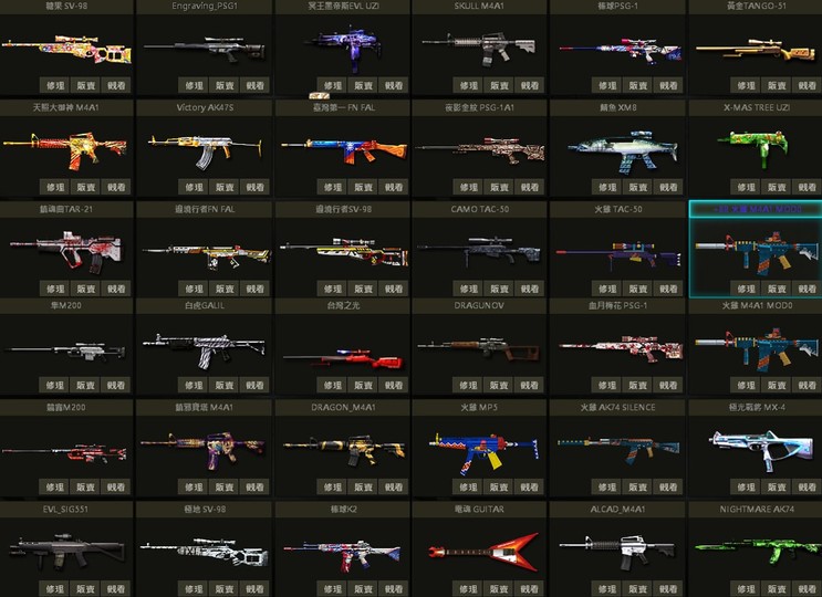白P、糖果邊境極地SV、冥王U、天照、8把M4、鯖魚XM8、火雞TAC、邊境之刃