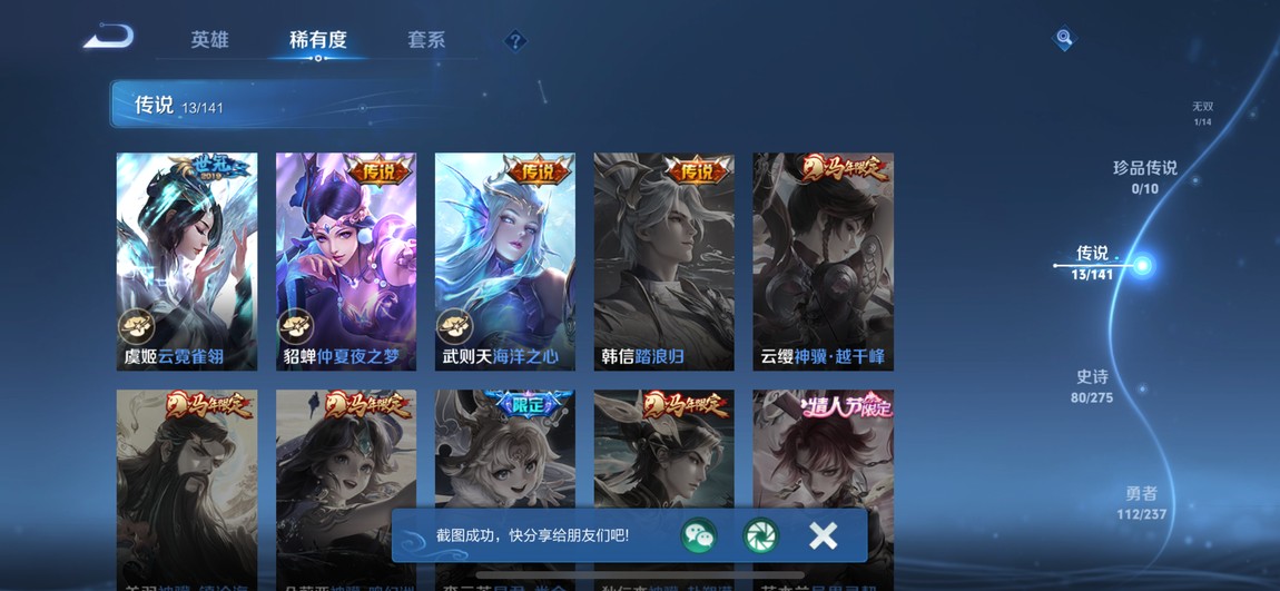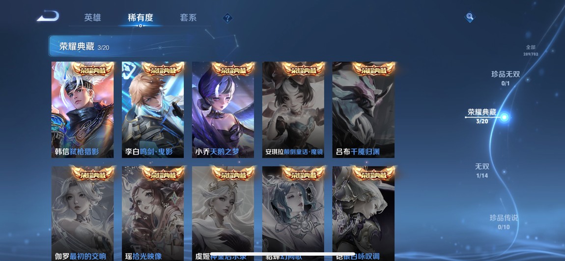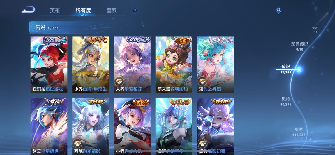 傳說:追逃遊戲 安琪拉、山海 小喬、摯愛花嫁 大喬、花潮如約 蔡文姬、時之祈願 瑤、世冠 趙雲、fmvp 西施、心動 小喬、啟明 虞姬、貓影 貂蟬、世冠 虞姬、仲夏夜 貂蟬、海洋之心 武則天