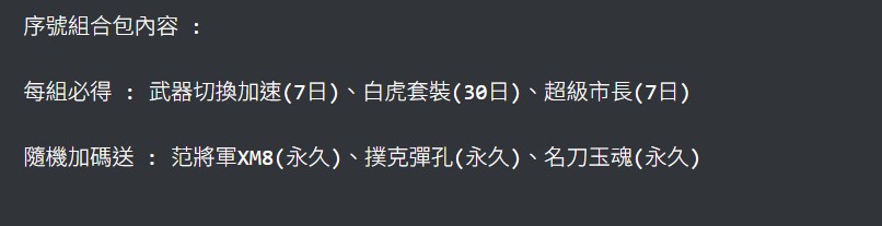 2026專屬卡序號:必得 武器切換加速(7日)、白虎套裝(30日)、超級市長7日
