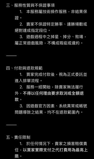 2. 賣家不保證特定勝率、連勝場數或絕對達成指定段位。