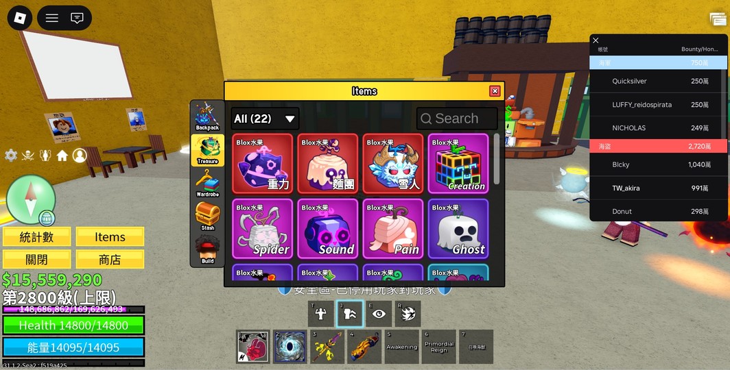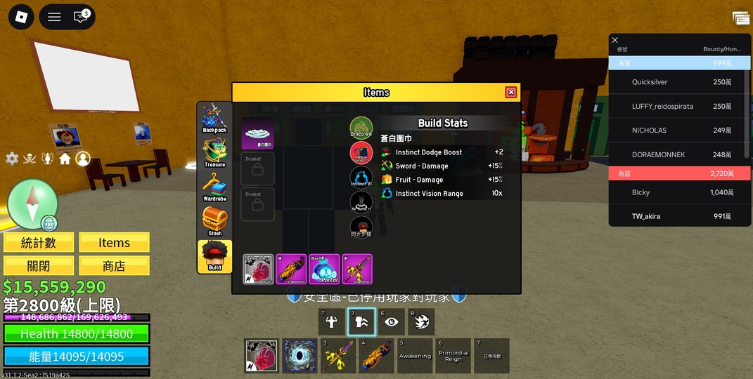 PVP 數據: * 1000 萬賞金 (10M Bounty):解鎖「海王類召喚」技能,並擁有強力的傷害與防禦加成。