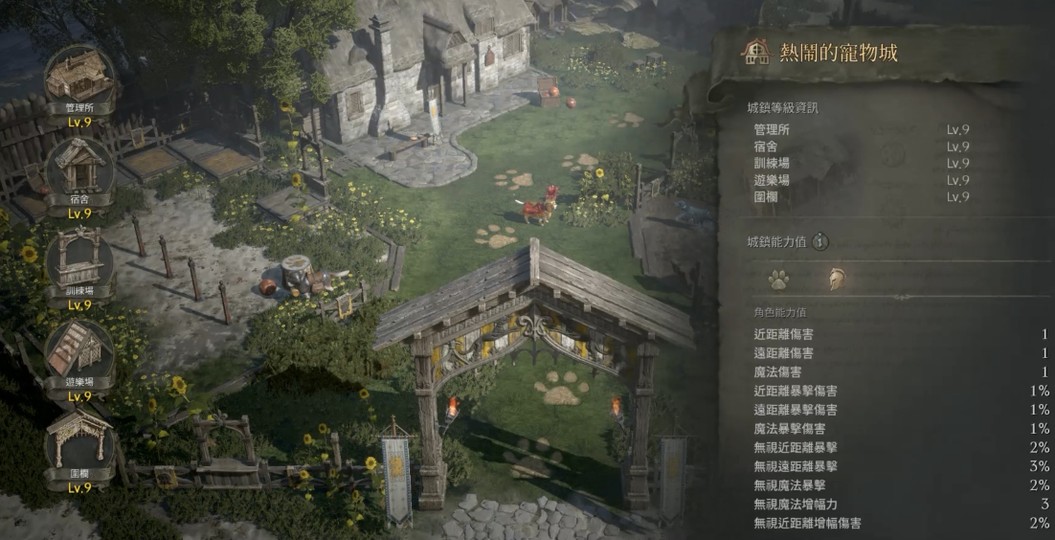 【寵物城】:管理所Lv9、宿舍Lv9、訓練場Lv9、遊樂場Lv9、圍欄Lv9