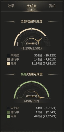 收藏 整體完成度79.881% / 白95.45% / 綠 97.26% / 藍63.57% 隨著進度增加變化