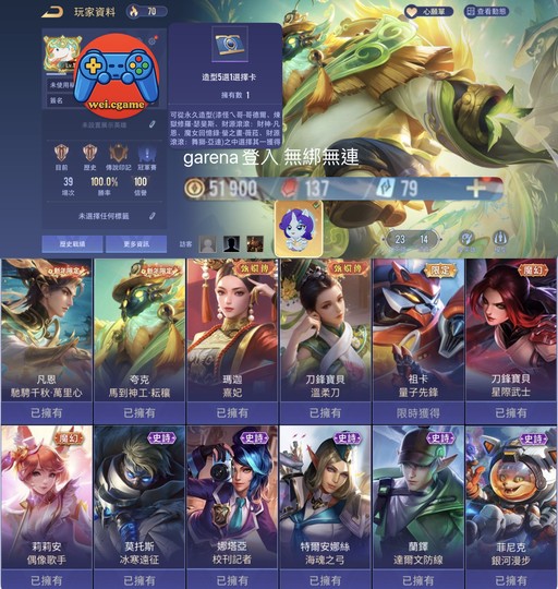 【Garena帳無綁無連、青銅、無VIP、23英、14造】凡恩 夸克新年 漆怪ㄟ哥 熹妃 蘭鐸達爾文 多金幣 珍奇寶 金色源寶 百勝無綁無