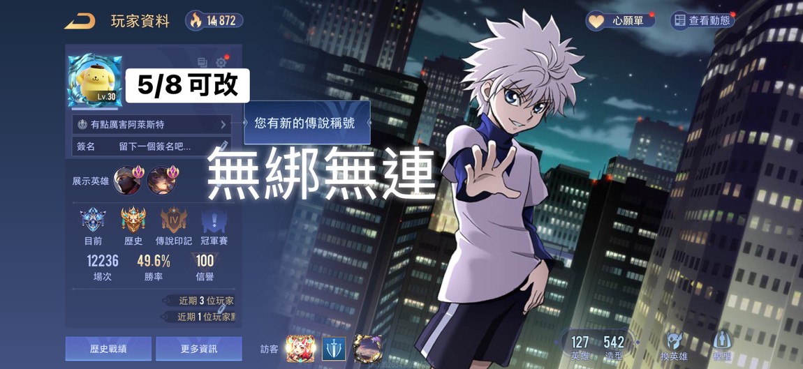 【Garena帳無綁無連、先鋒傳說·光影、V9、127英、542造】《退遊》酷洛米、墮天碎冠、白哉、奇犽、碎月、颯枷Sdream、大耳狗、三麗鷗