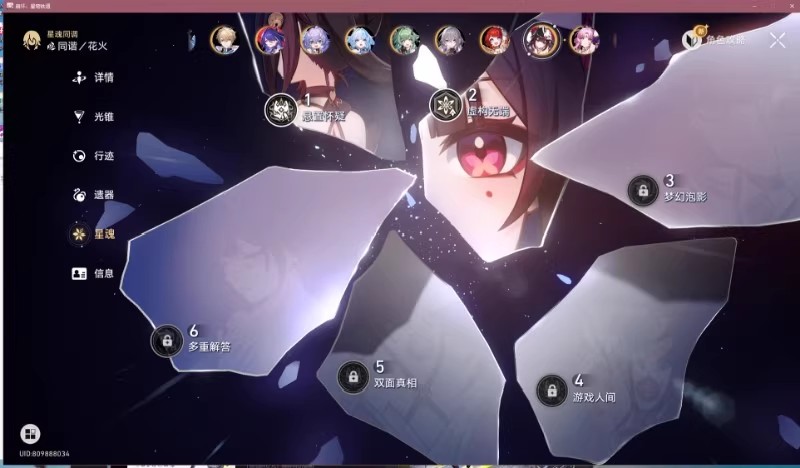 五星角色:滿命布洛妮婭,5命傑帕德,3命克拉拉,2命遐蝶,2命白厄,2命知更鳥,2命丹恒飲月,2命花火,2命銀狼,2命希兒,2命白露,1命流螢,1命昔漣,1命緹寶,1命符玄,遐蝶,緹寶,風堇,知更鳥,黃泉,阮梅,流螢,花火,藿藿,鏡流,符玄,丹恒飲月,羅剎,銀狼,希兒,布洛妮婭,白露,傑帕德,瓦爾特,彥卿,克拉拉,姬子,白厄,Archer,刻律德菈,長夜月,丹恒騰荒,昔漣,真理醫生;