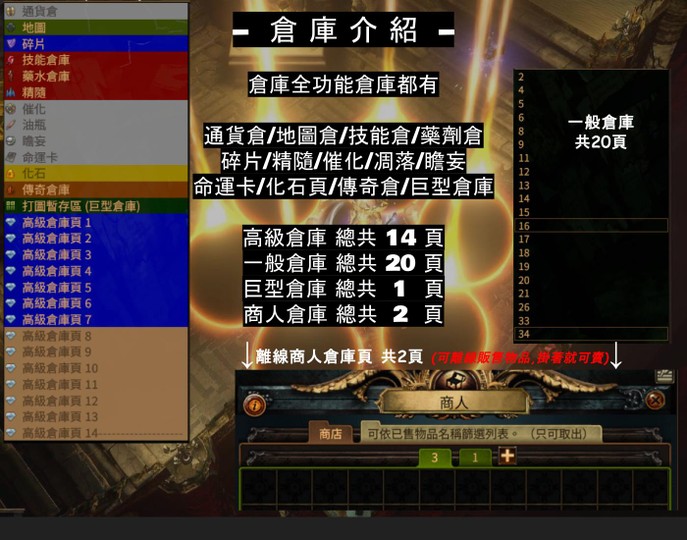 高級倉庫頁 14 頁  普通倉庫有20頁(可在自己升級高倉)  離線商人交易倉庫頁 2 頁