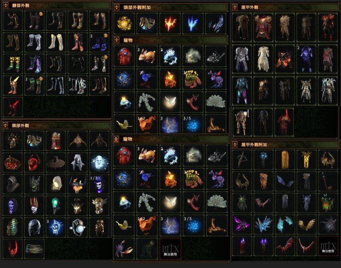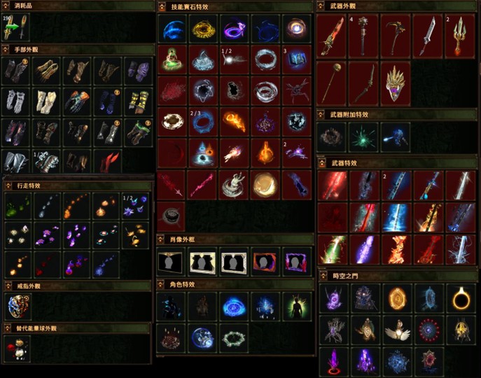 通貨倉 . 碎片頁 . 地圖 . 藥劑 . 技能 . 瞻妄倉 . 油瓶(凋落)倉 . 精髓倉  . 命運卡倉 . 傳奇倉 . 化石倉 . 通牒(催化)倉 . 巨型倉庫