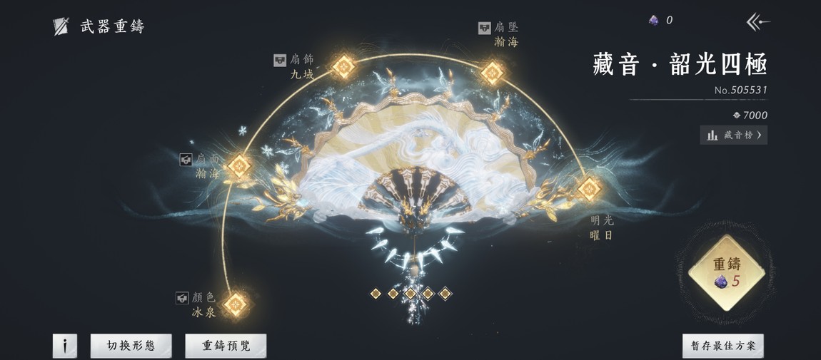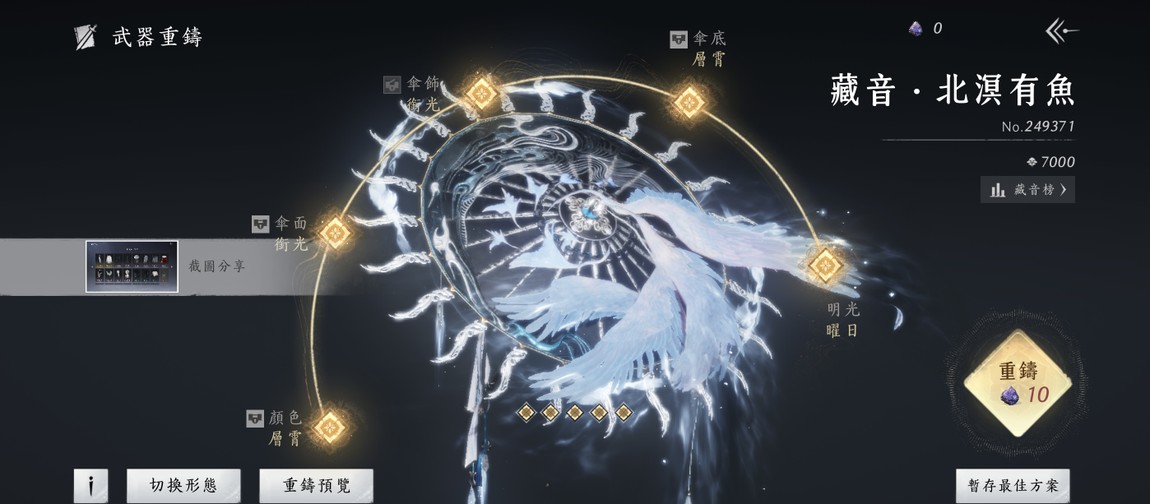 武學特效:鳴金虹萬劍歸宗(劍)、龍騰九霄(槍)、青鸞望月(九重春色傘)