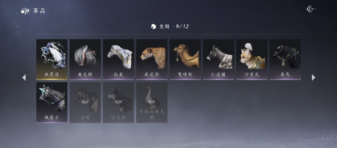 坐騎:幽靈速、豹、駱駝、採集馬、自動撿裝備、驢、貓咪、秦馬、飛毛腿