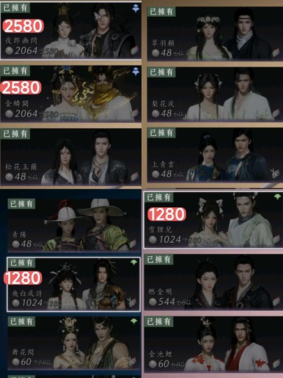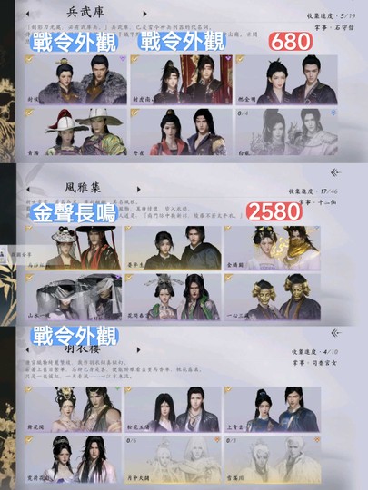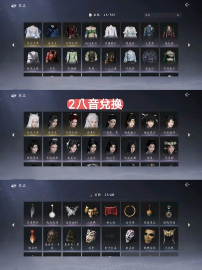弄清影(2)+青丘(2)+傘藏音外觀(1)+扇藏音外觀(1)+九重春色武學特效(1)+明川藥典武學特效(1)+1未用八音竅(1)